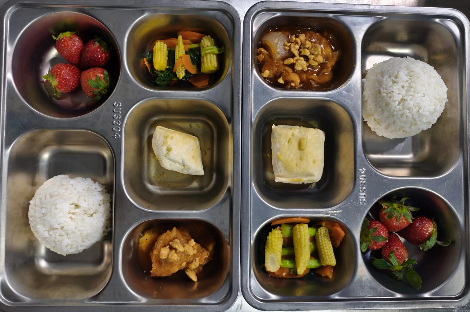 Menu hari ini menghadirkan Kungpou Chicken dan Lohan Cay yang kaya akan nutrisi, ditutup dengan buah Strawberry segar yang tinggi antioksidan untuk menjaga kebugaran siswa menjelang akhir pekan.